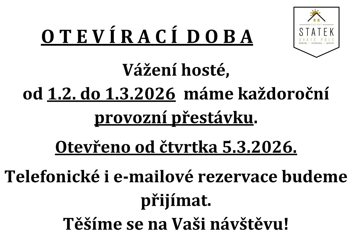 Vážení hosté, od 1.2. do 1.3.2026 máme každoroční provozní přestávku. Otevřeno od čtvrtka 5.3.2026. Děkujeme za pochopení. Rodina Hoffmanova.